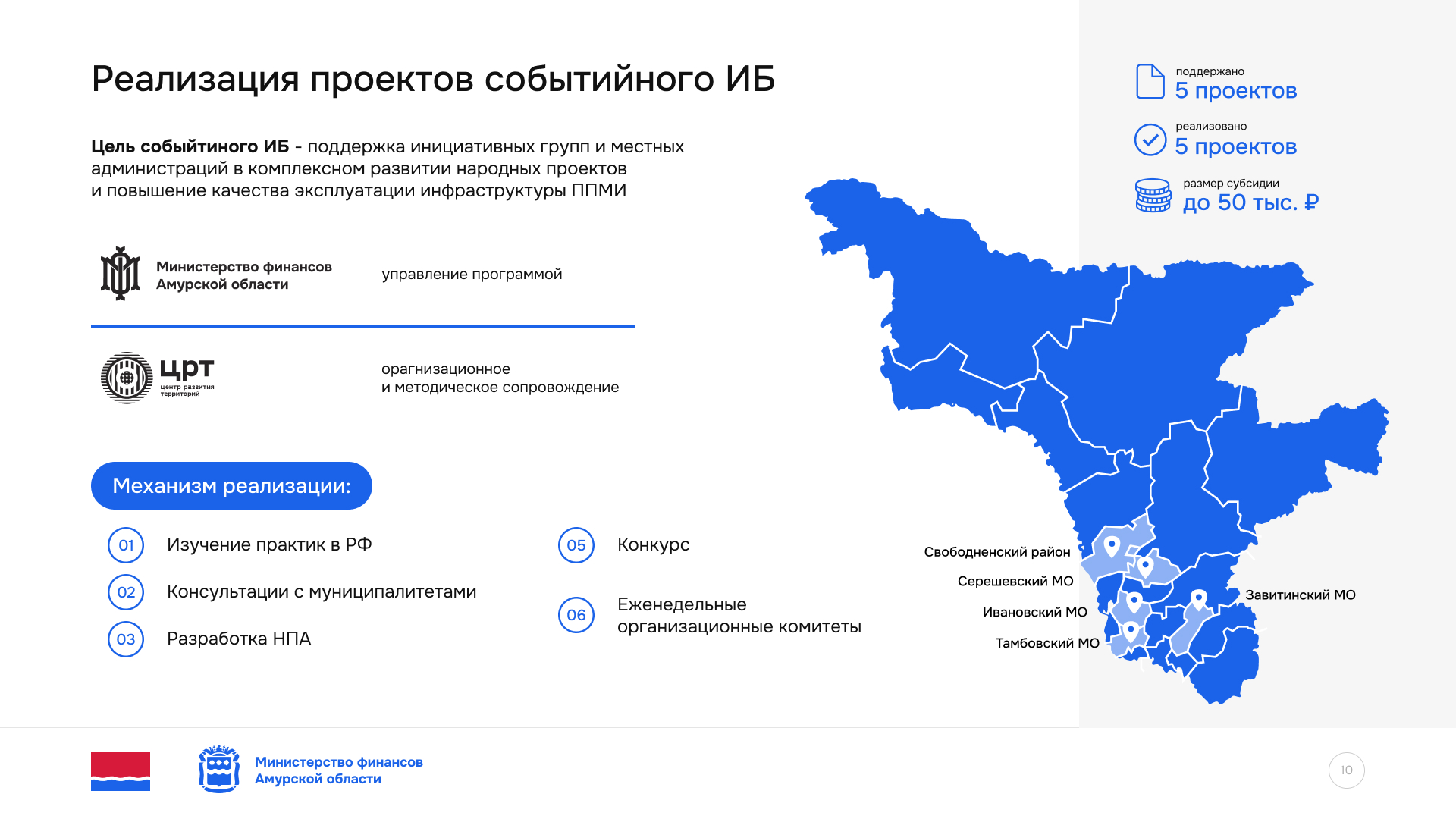 Программа инициативного бюджетирования стартовала в Амурской области в 2017 году. Проект реализует региональное Министерство финансов. Кроме того, поддержу участникам оказывает Центр развития территорий.
