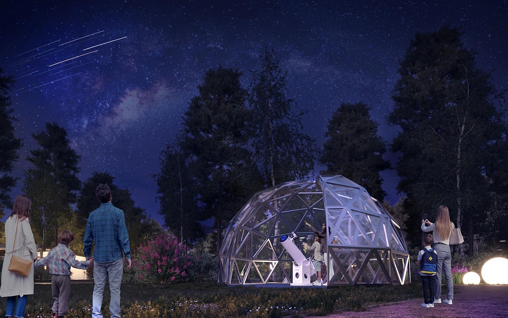 О тематическом направлении парка будут напоминать объекты. Качели, кафе, трибуны и навесы вызовут ассоциацию с интерьером космического корабля, батуты на детской площадке расположат в виде созвездия Большая Медведица. А еще в парке установят небольшую обсерваторию для наблюдений за звездами.