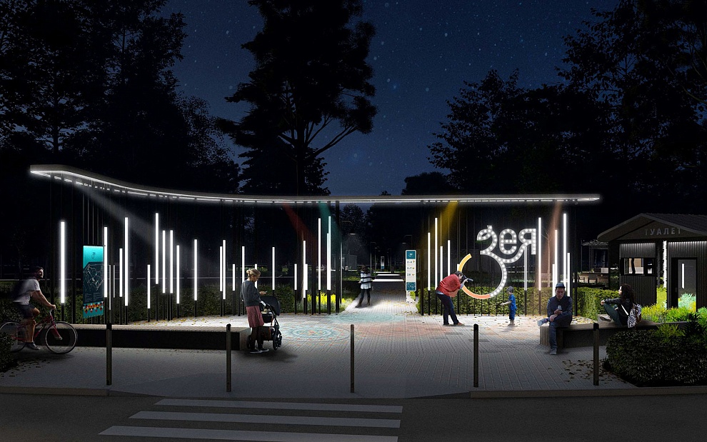 Со стороны улицы Полины Осипенко и переулка Пушкина установят главную входную группу с колоннами, подсветкой и светящимся логотипом с новым названием парка — «Зея». Неподалеку разместят павильон-лекторий с функцией летнего кинотеатра.