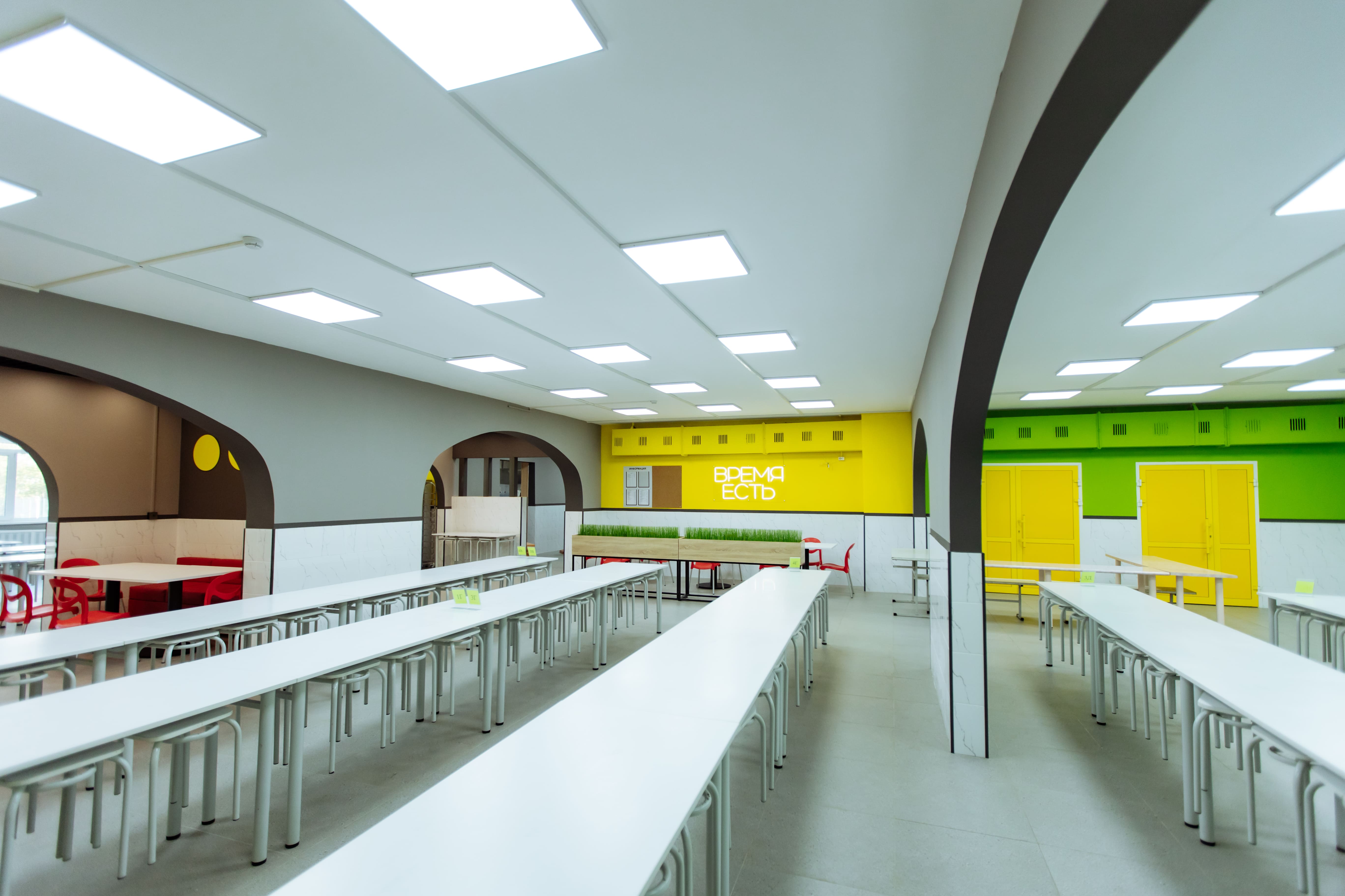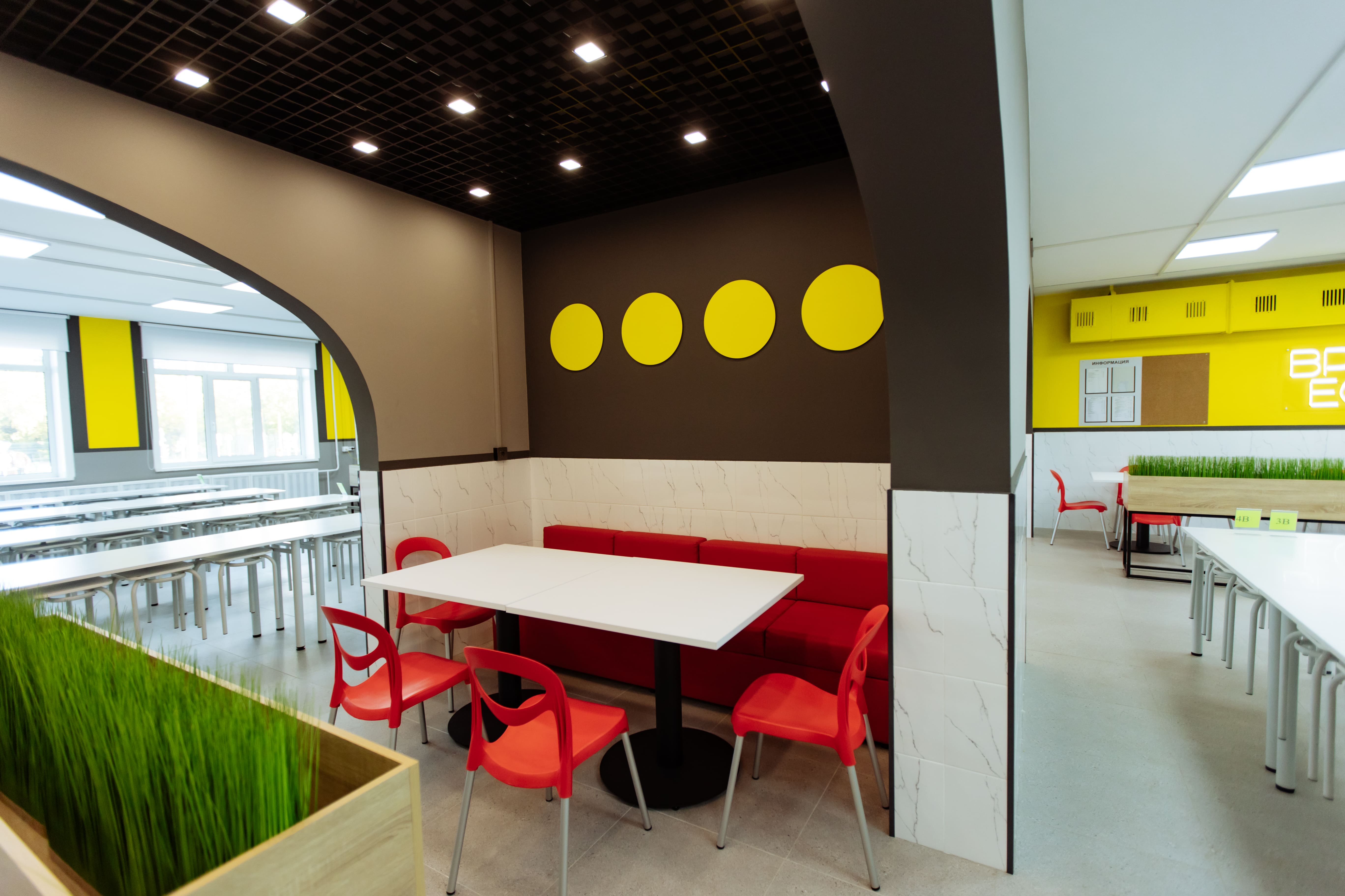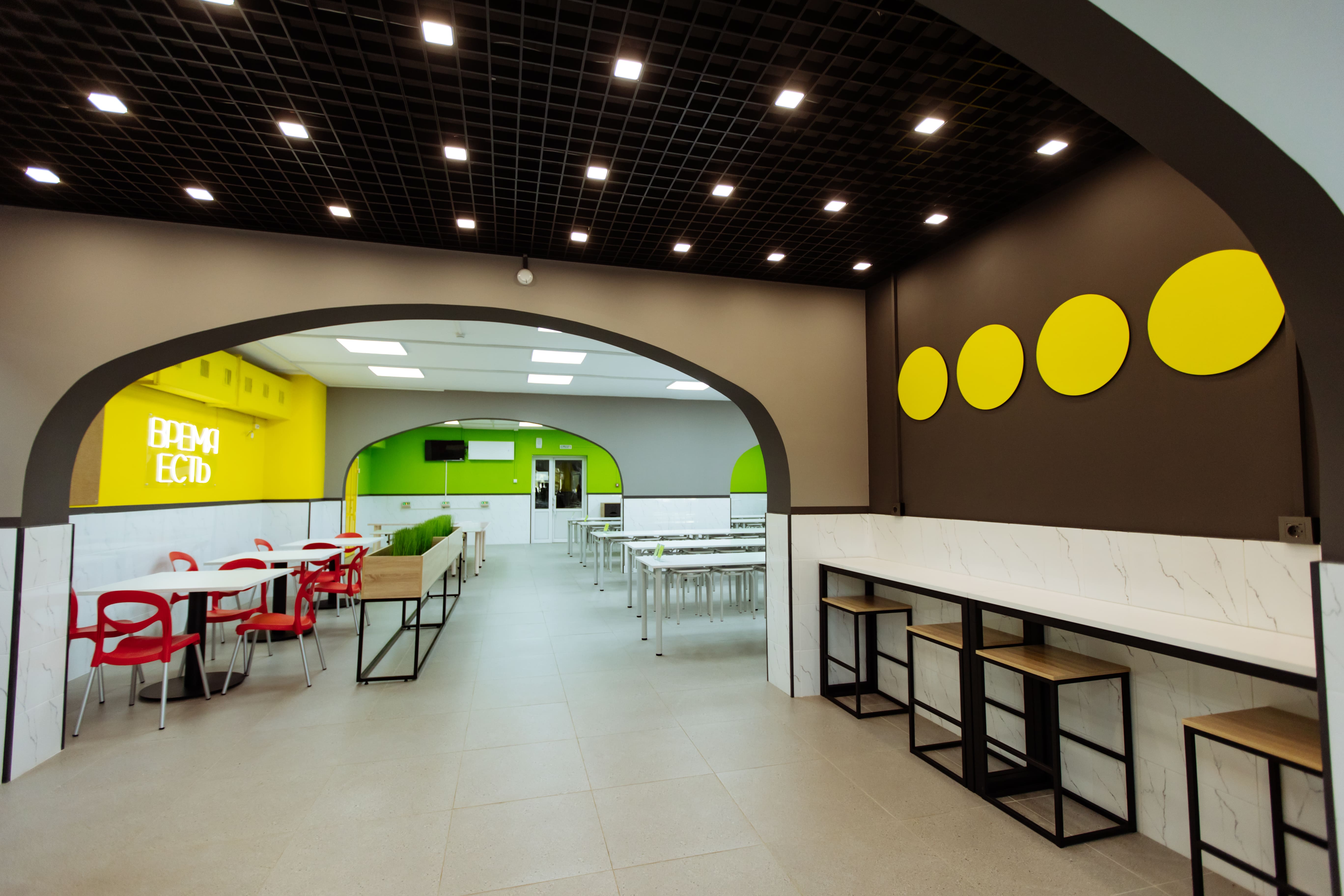 — Пространство столовой имеет общую площадь 264,76 «квадрата». Оно предназначалось для организации питания учащихся всех возрастных групп, а также педагогического состава. Кроме того, в столовой ученики проводят перемены, отдыхают и общаются, — рассказала руководитель проекта отдела дизайна интерьеров социальных и общественных зданий Елена Хоружева. — Школьное кафе своей атмосферой и эстетикой должно прививать детям позитивное и осознанное отношение к еде, формировать культуру питания.