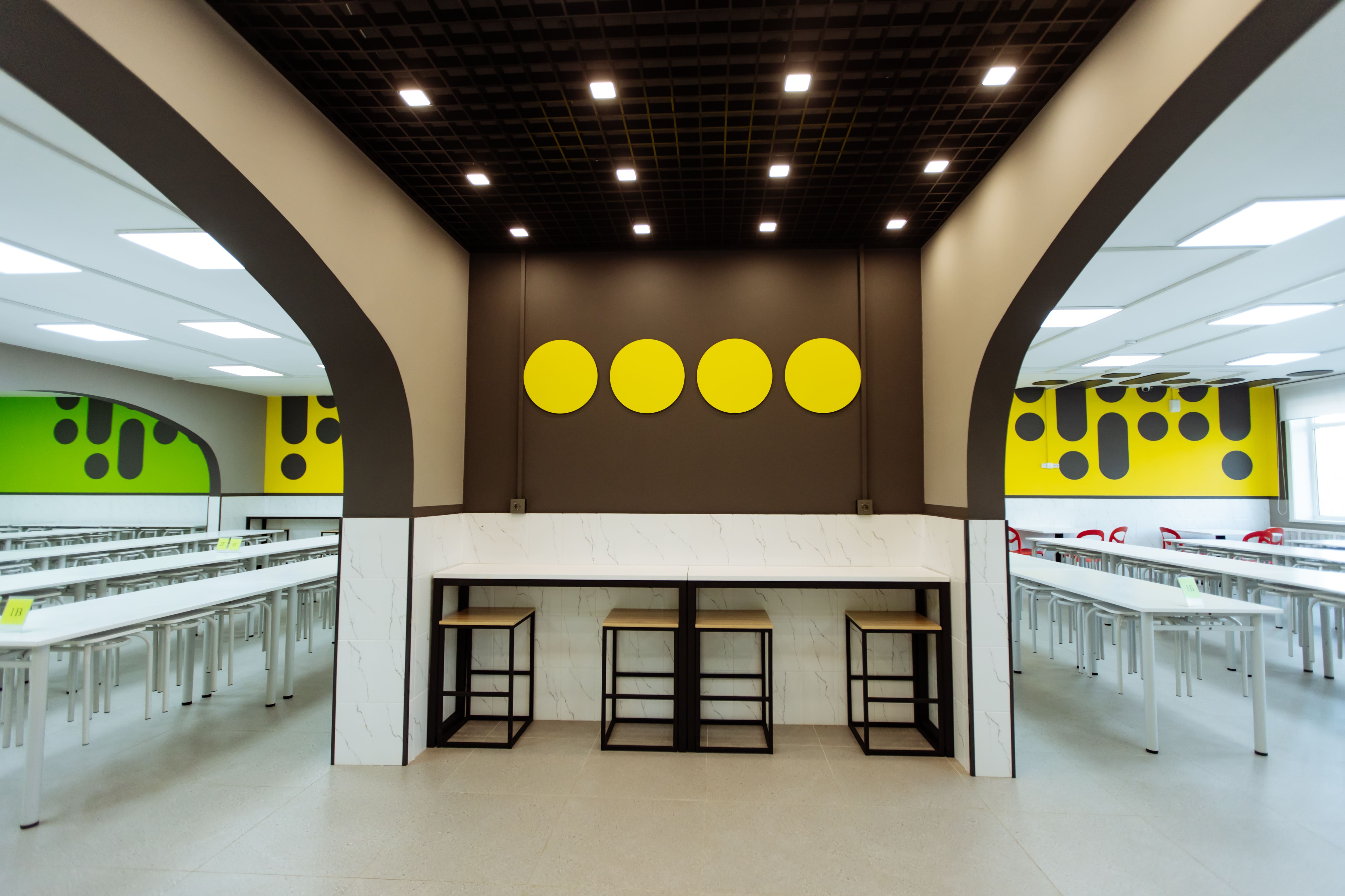 Дизайнеры предложили вариант декорирования зоны раздачи и ее зонирования, разработали два обеденных зала для начальных классов, буфет с полубарными стульями и столами, с местами для приема пищи стоя. На входе в столовую предусмотрели шкафчики на замках, куда школьники смогут убирать сумки и рюкзаки.