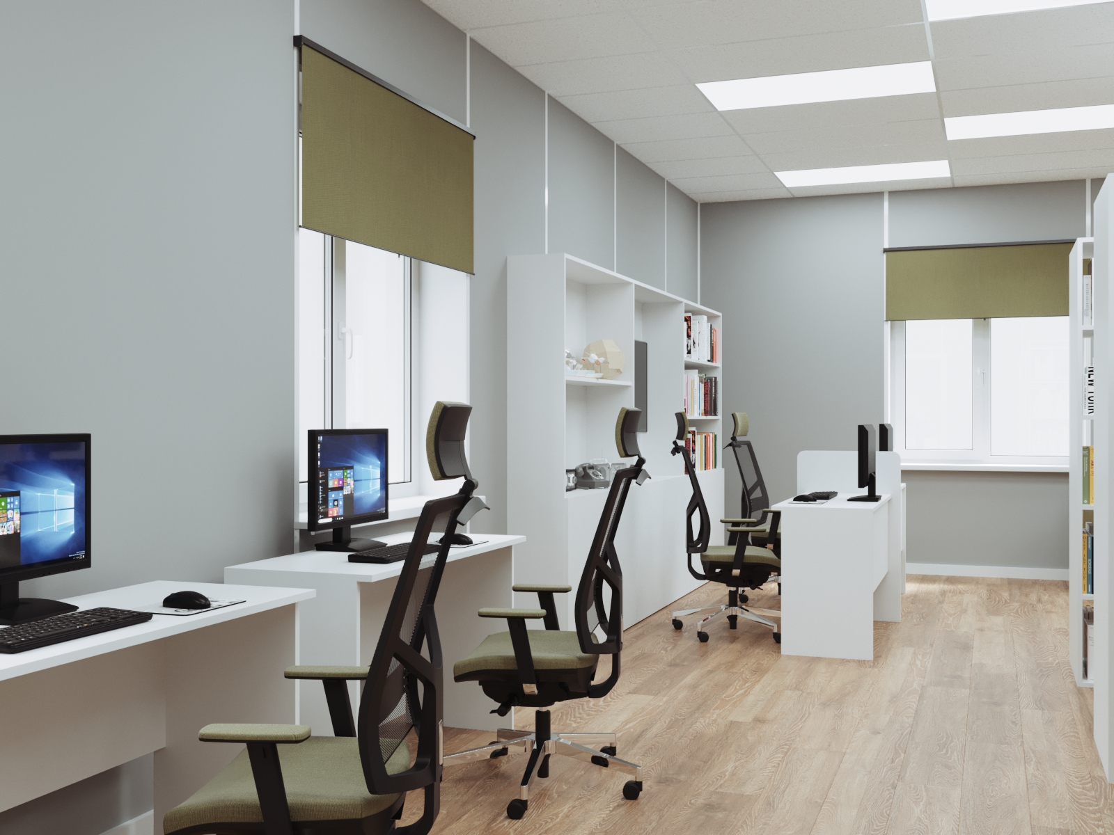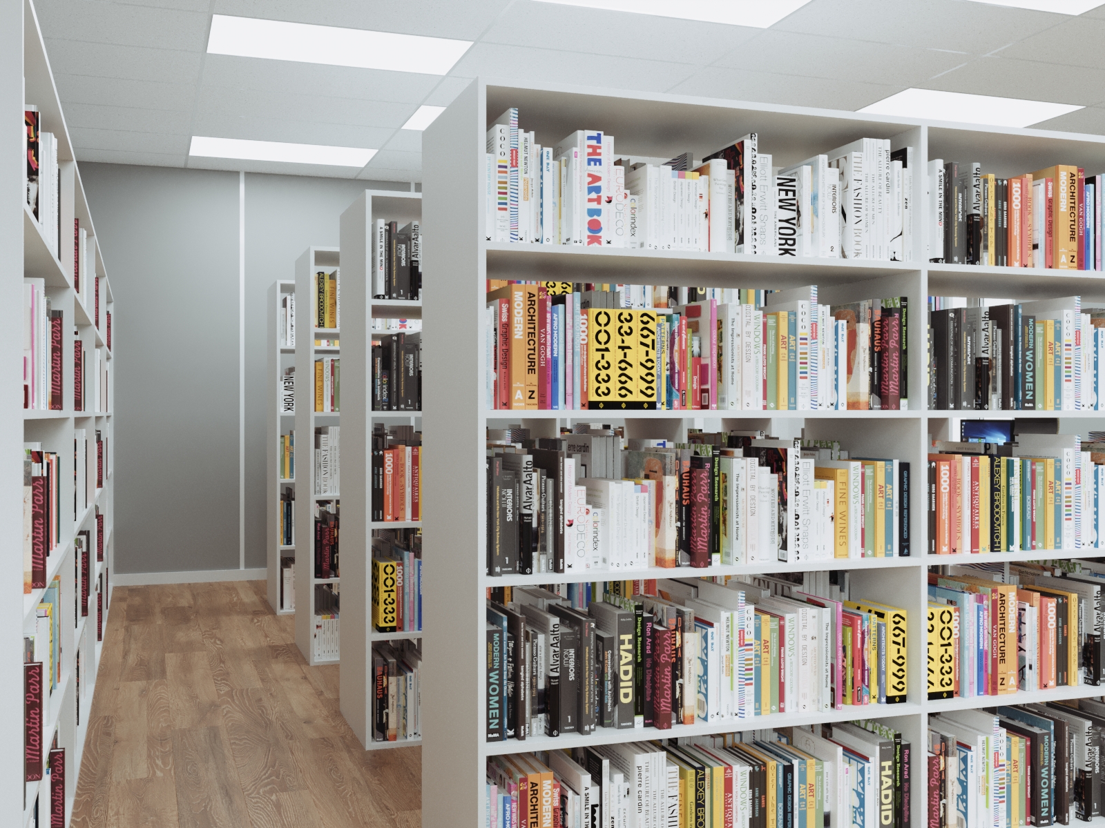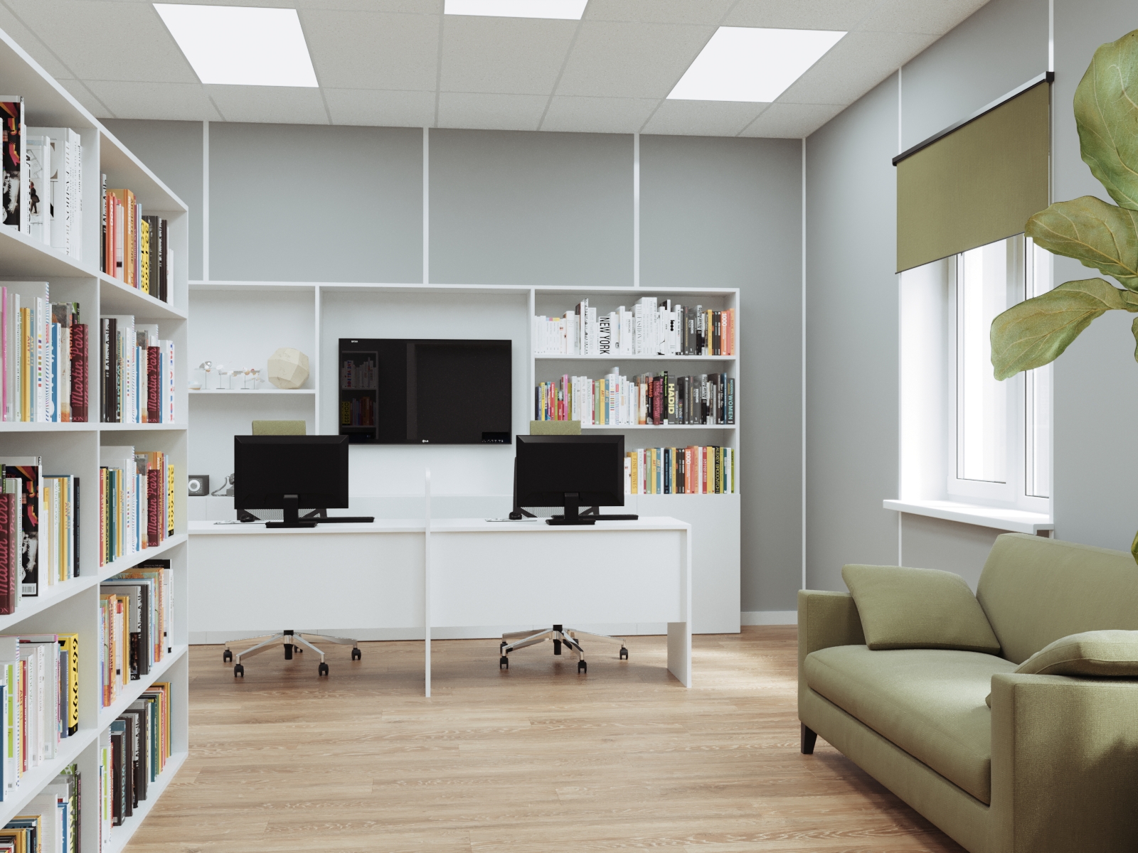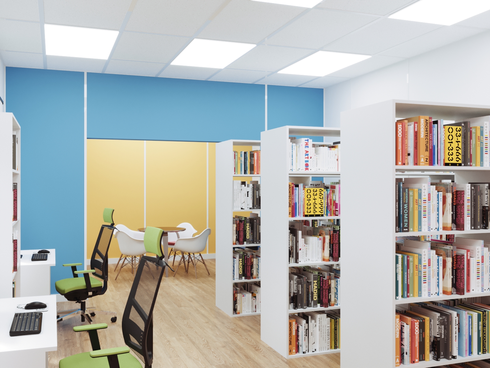 Продумывая дизайн интерьеров библиотеки, выбор остановили на скандинавском стиле. Для проекта выбрали натуральные материалы сдержанных оттенков. Светло-серые стены, напольное покрытие «под дерево», белая мебель. Цветовые акценты предусмотрели на некоторых стенах и в текстиле.