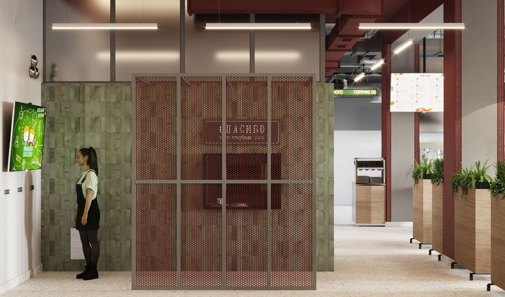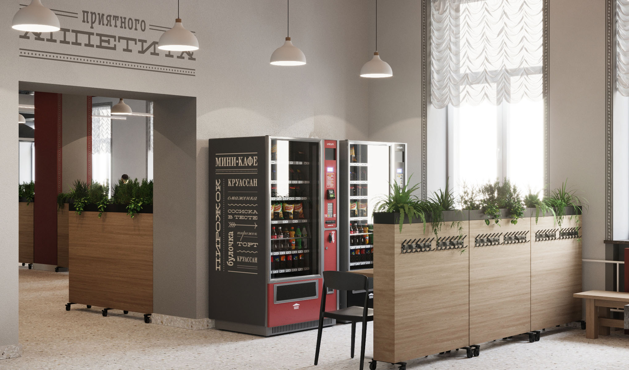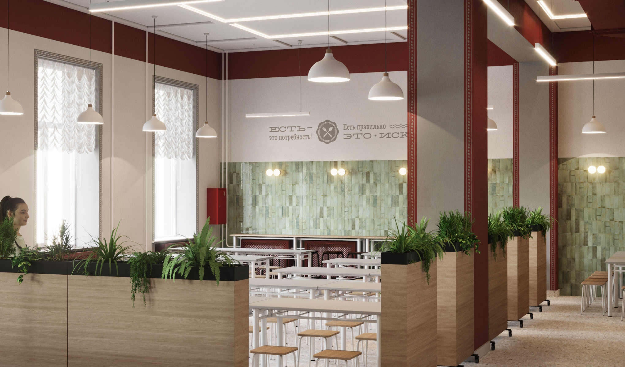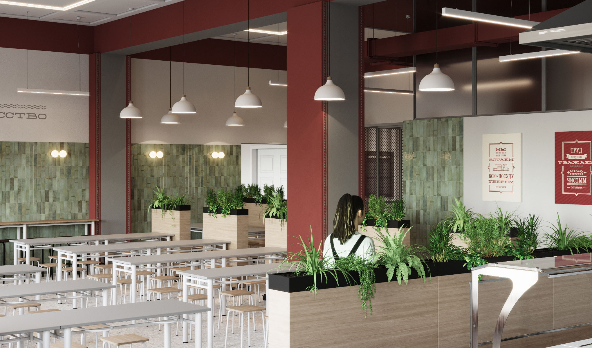 Чтобы сделать зоны приема пищи более уютными, дизайнеры предложили использовать в проекте невысокие мобильные перегородки. Текстура дерева и растения во встроенных кашпо дополнят атмосферу столовой. Перегородки будут разделять столики и умывальную зону, а также проход к линии раздачи.