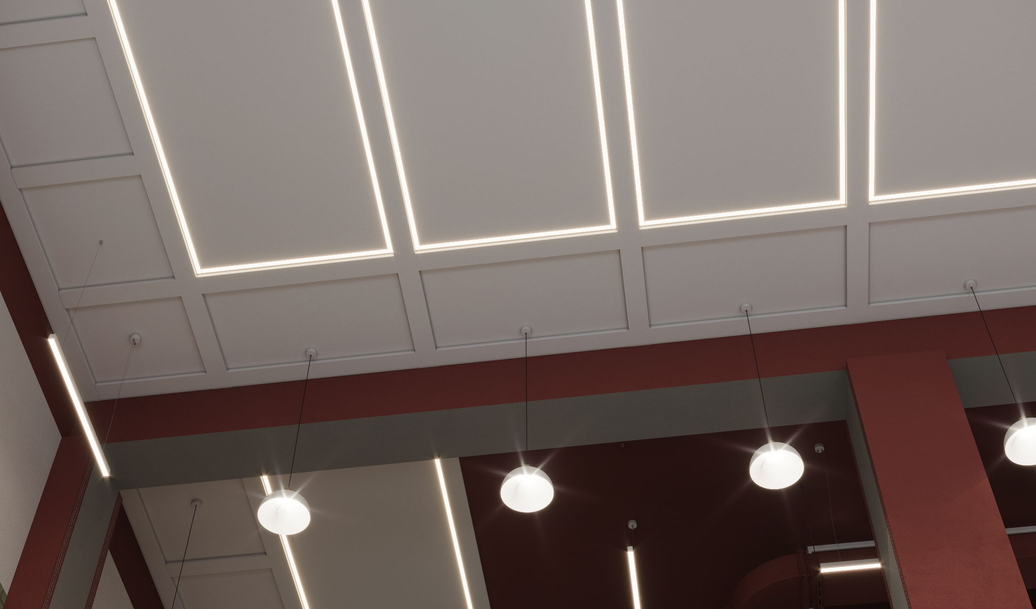 Дизайнеры тщательно продумали схему освещения столовой. В проекте использовано сразу несколько видов светильников: линейные встроенные и подвесные с регулируемой яркостью, настенные бра. Зоны над столами дополнительно оборудованы подвесными люстрами.