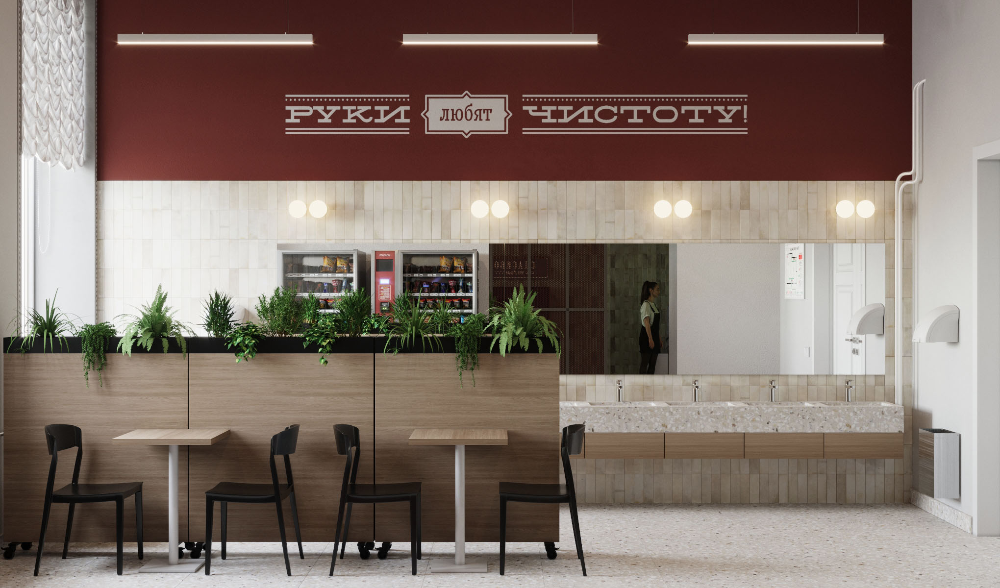 Дизайнеры учли различные сценария использования столовой и адаптировали под них проект. Пространство не ограничивается общим залом для обедов. В нем также предусмотрели зону для быстрого приема пищи со столиками на две персоны и вендинговыми автоматами. В этом же зале расположены умывальники для младших школьников и учеников постарше.