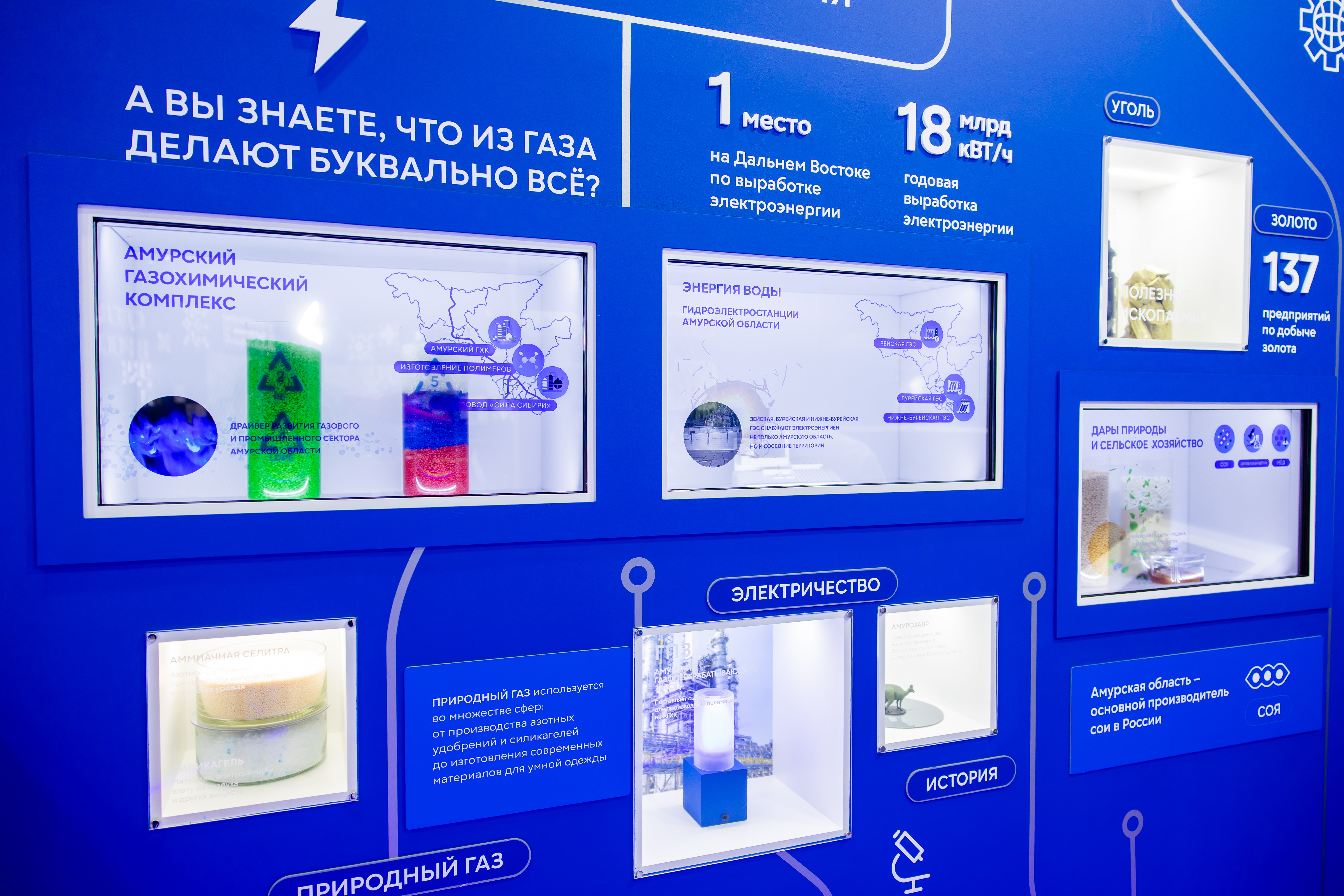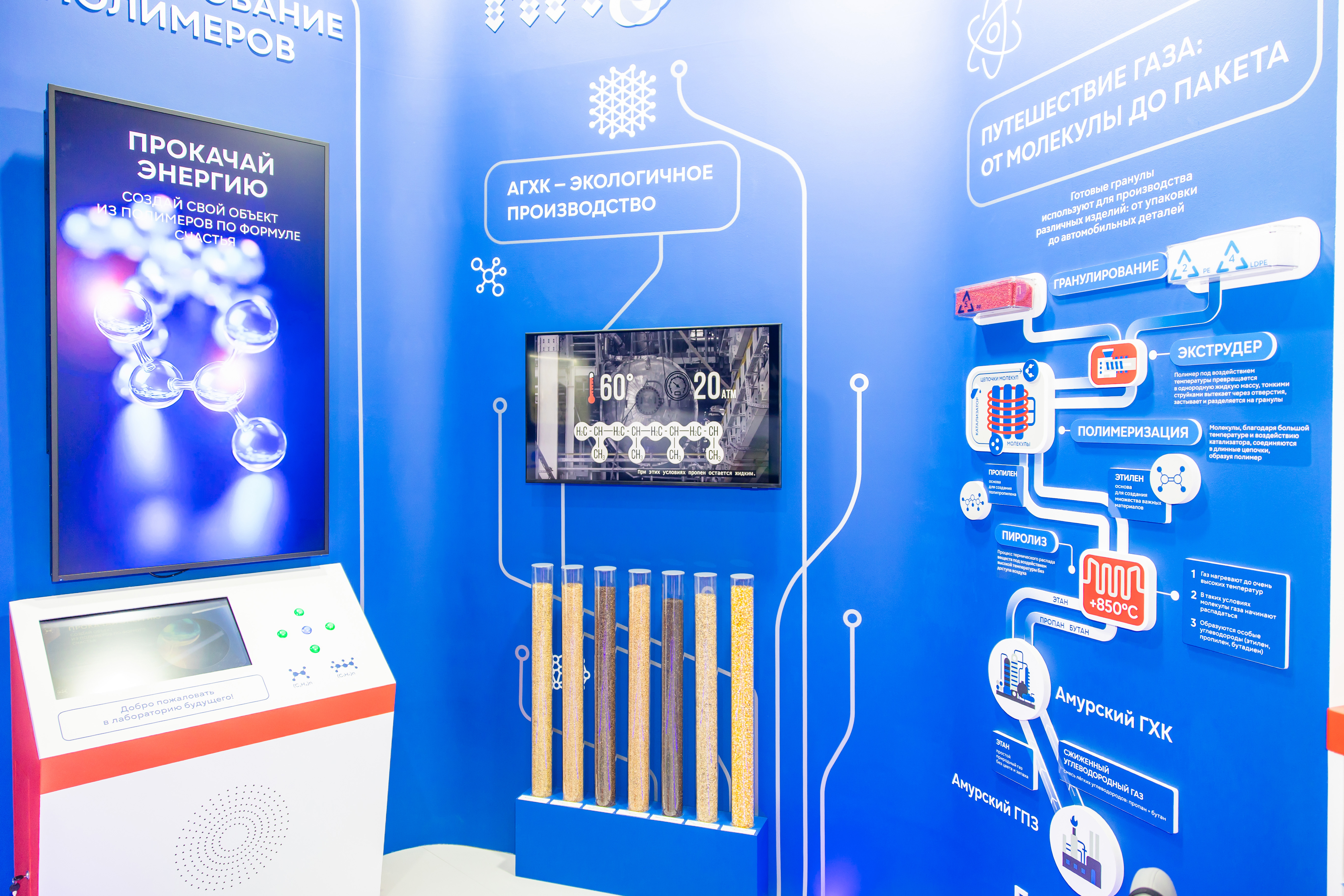 посетители стенда знакомятся с продукцией, производимой в Амурской области и богатыми природными ресурсами региона. На стенде можно собрать собственный инновационный продукт из полимеров, производимых на Амурском газохимическом комплексе, куда в будущем будут поставлять сырье по газопроводу «Сила Сибири».