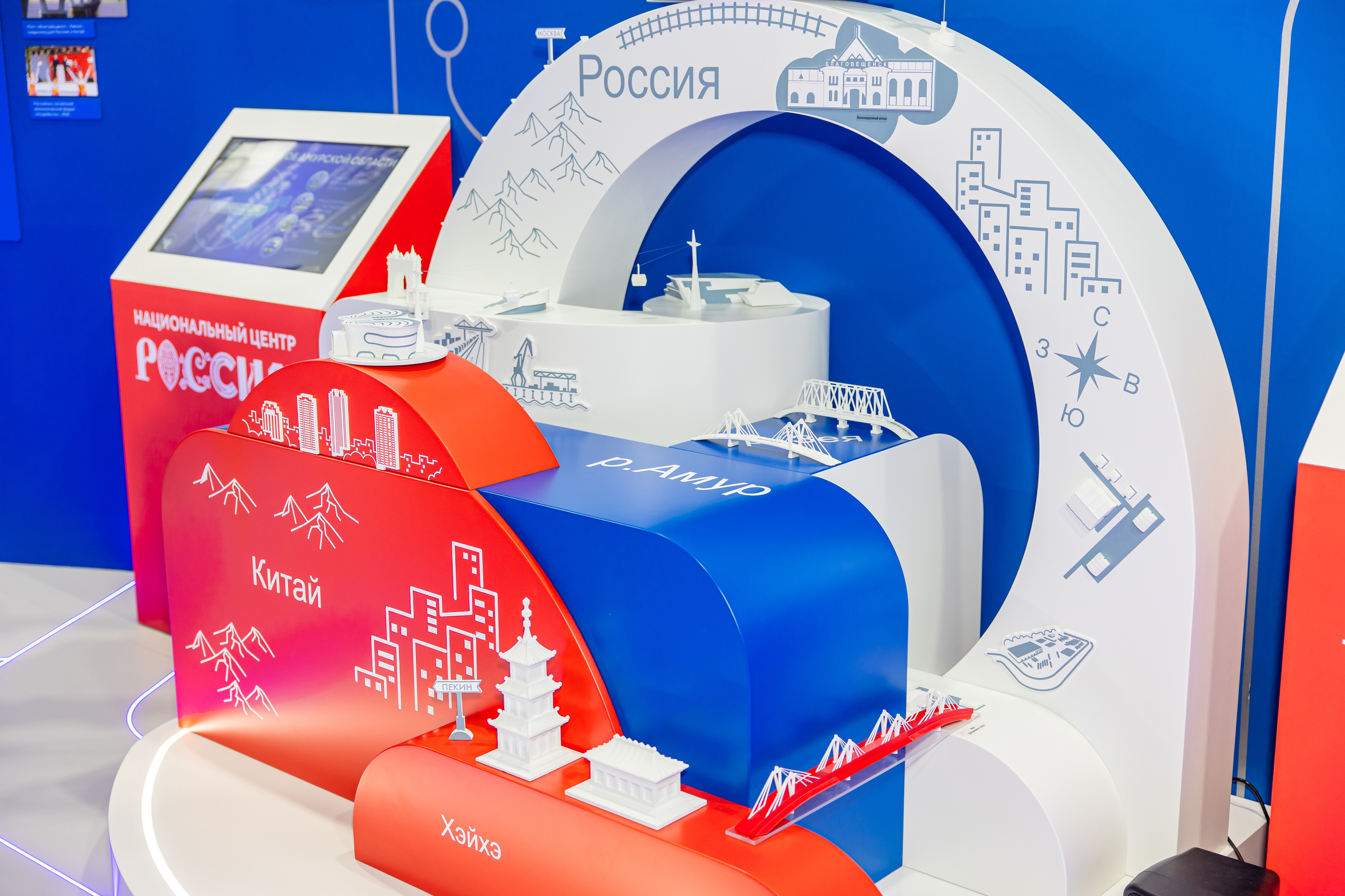 Экспозиция Амурской области сохраняет наследие и традиции Международной выставки-форума «Россия», но при этом фокус повествования смещен с развития космической отрасли на взаимодействие с Китаем и совместные проекты.