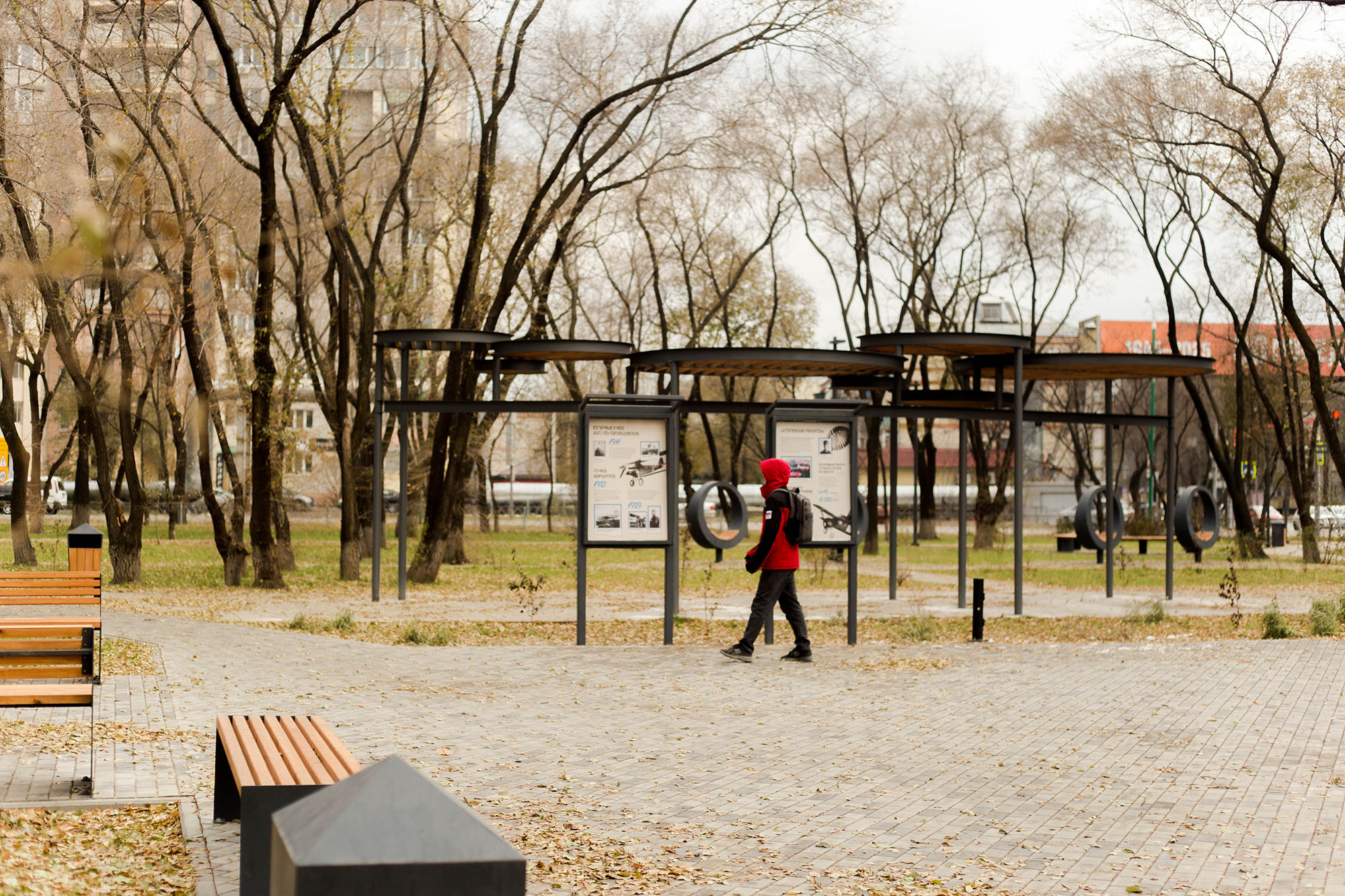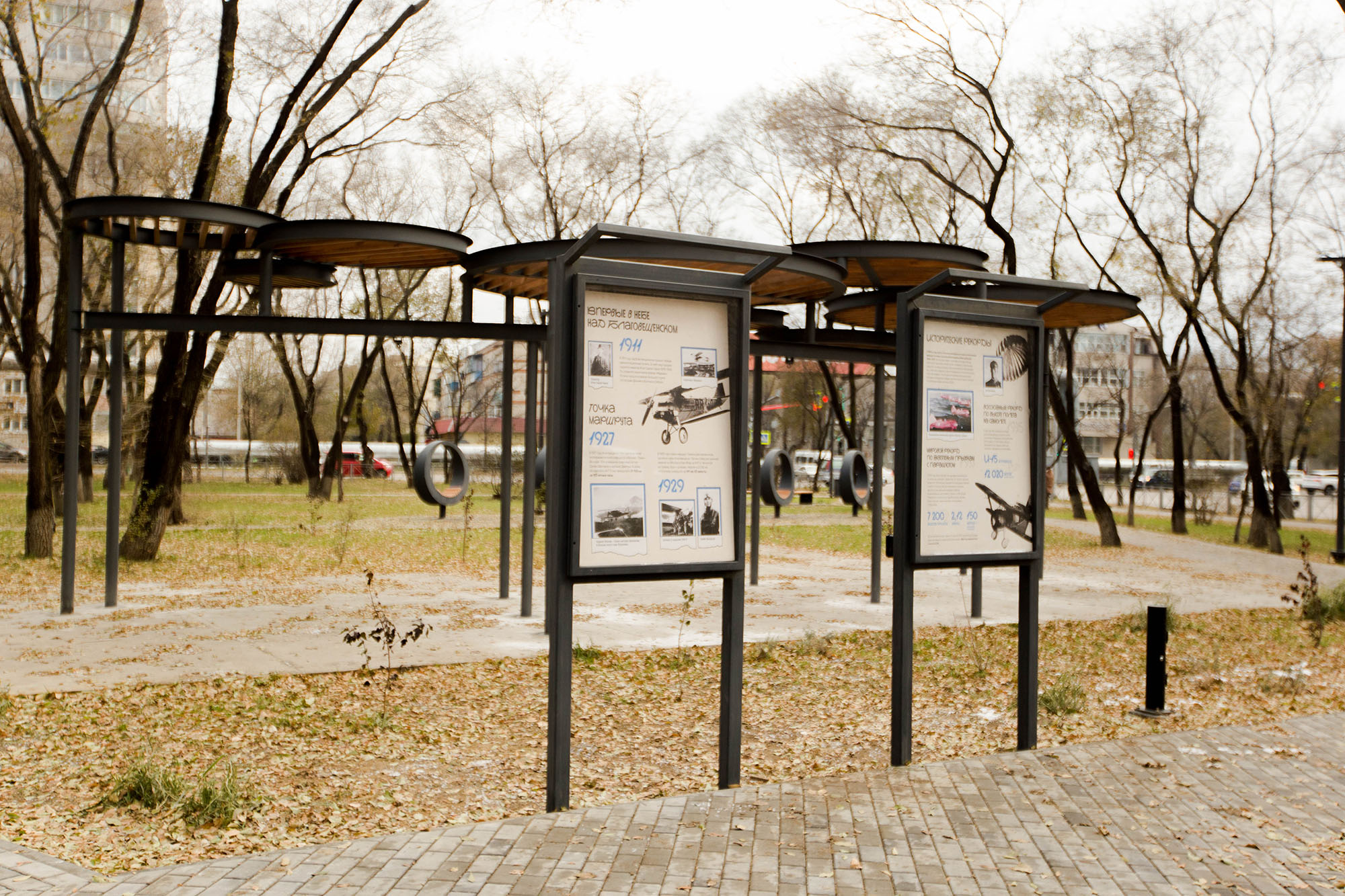 — На идею нас натолкнуло соседство с Амурским региональным отделением ДОСААФ России, чья работа связана, в том числе, с авиацией и авиационным спортом. Концепцию поддерживает тематическое оборудование. Кроме того, на территории появились стенды с информацией об известных жителях региона, чья жизнь связана с небом. К примеру, в сквере можно узнать про рекорды летчика и парашютиста Виктора Евсеева. Он первым из советских летчиков поднялся на истребителе И-15 в стратосферу на 11 080 метров, а в 1933 году побил мировой рекорд затяжного парашютного прыжка, — рассказывают разработчики концепции.