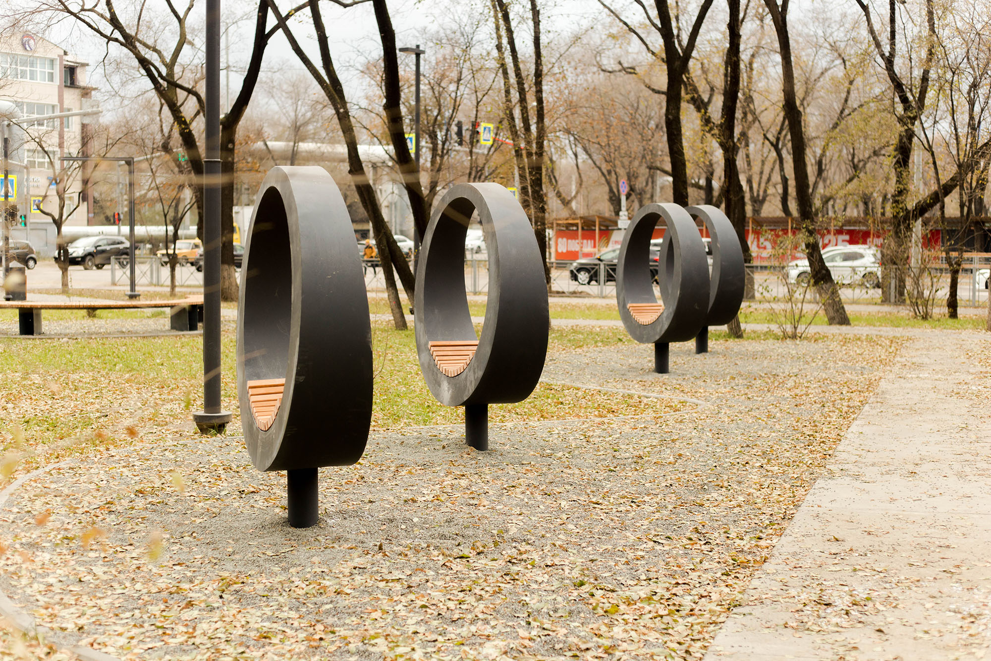 В северной части расположили еще несколько зон для тихого отдыха. Их оборудовали радиусными скамейками и скамейками, напоминающими кольца.
