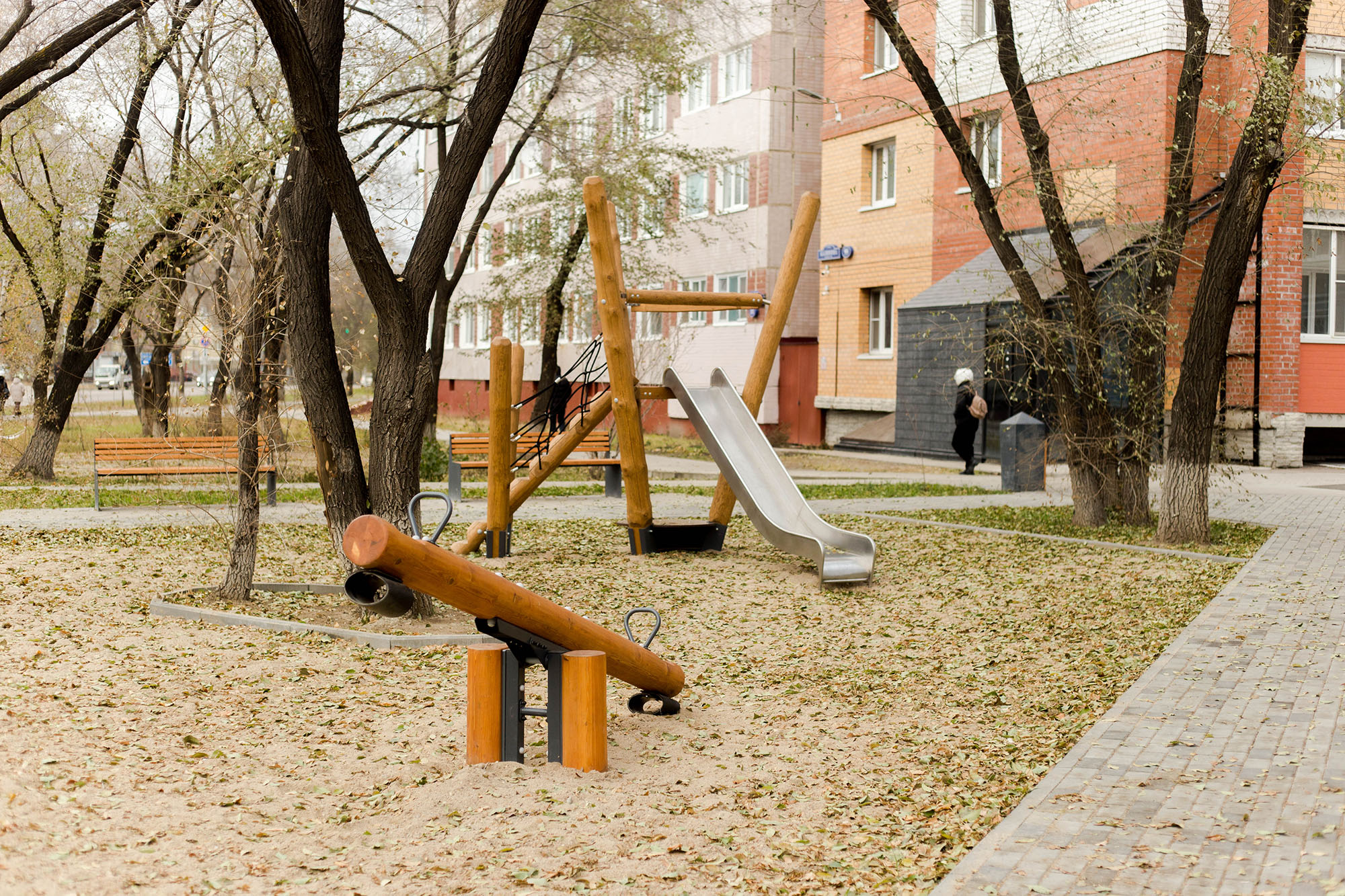 Два основных сценария использования сквера на Калинина – Октябрьской — тихий отдых и прогулки с детьми. В южной части пространства оборудовали детскую площадку с качелями, горкой и игровым комплексом в виде самолета.