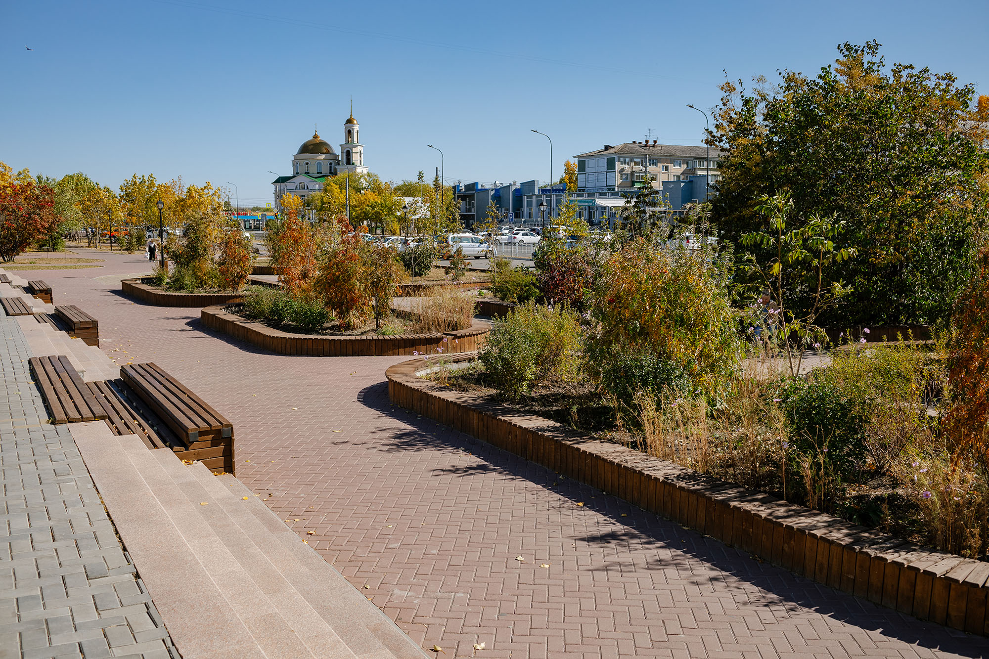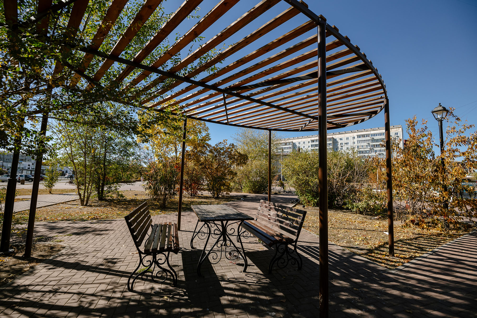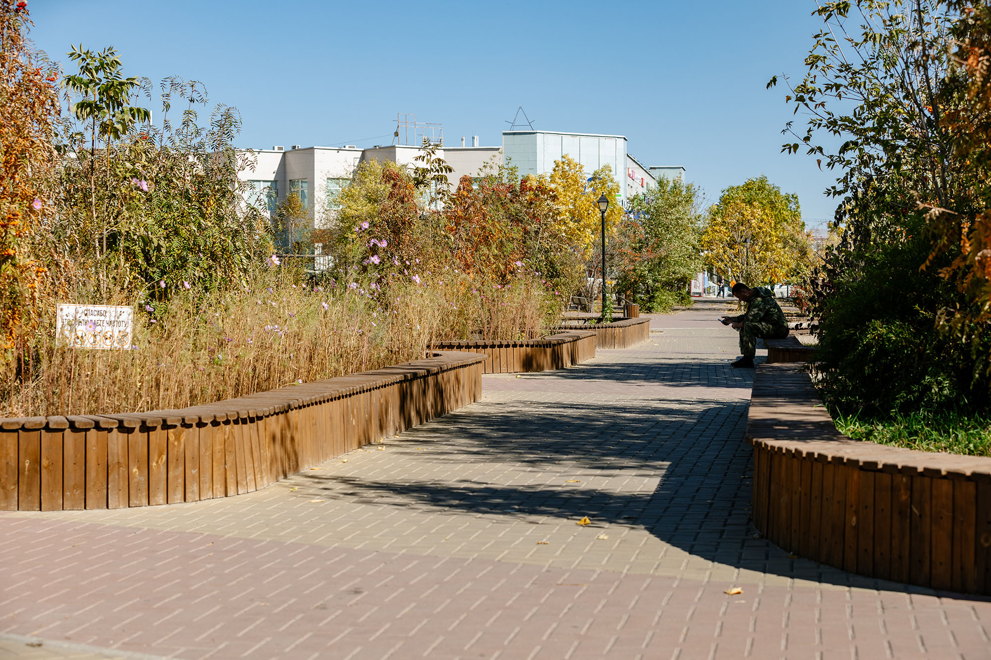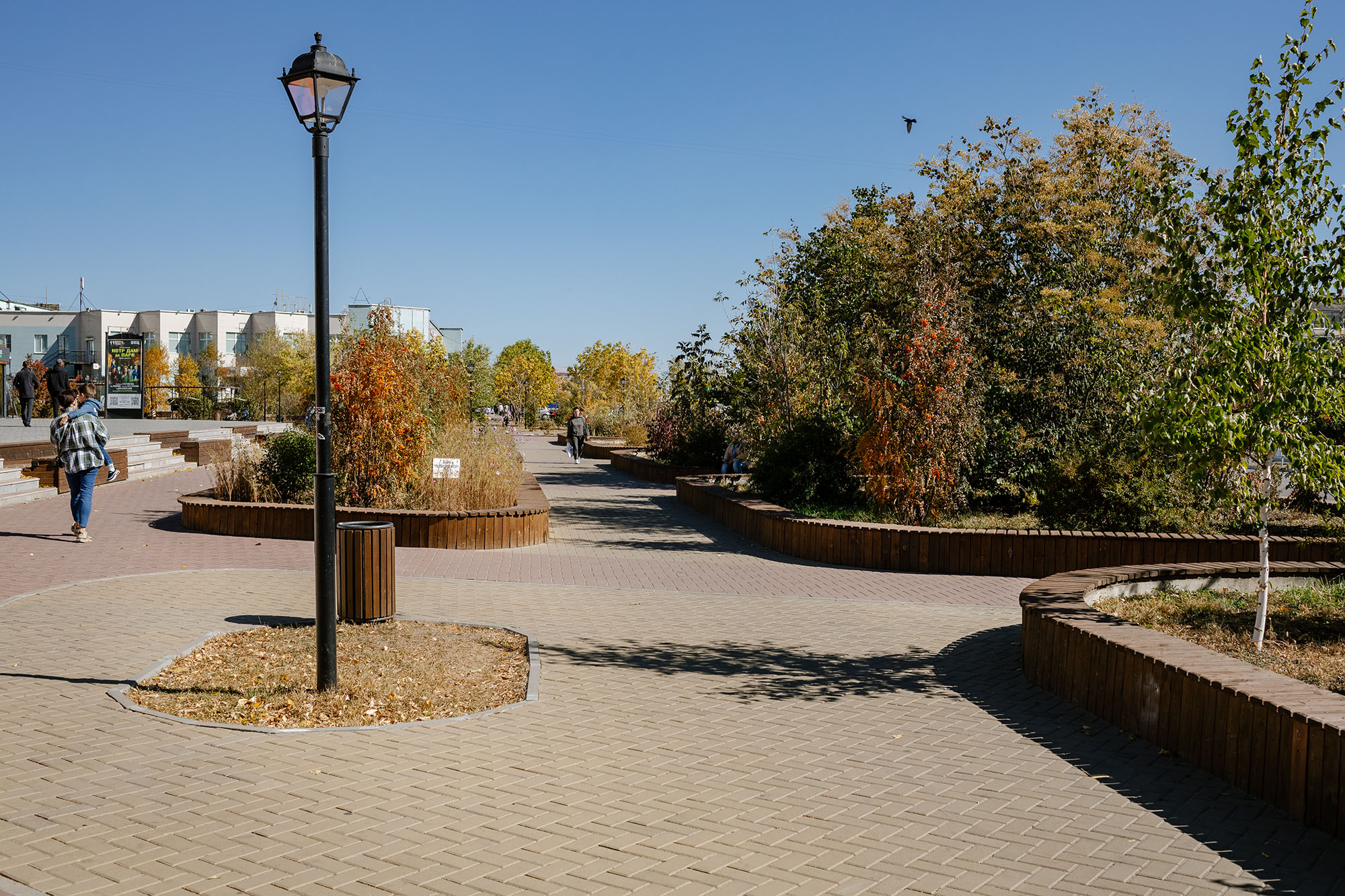 - Для транзита и короткого отдыха: удобные скамейки напротив филиала ОКЦ (бывшего кинотеатра), поднятые газоны, борта которых оформлены деревом и совмещают функцию мест отдыха.