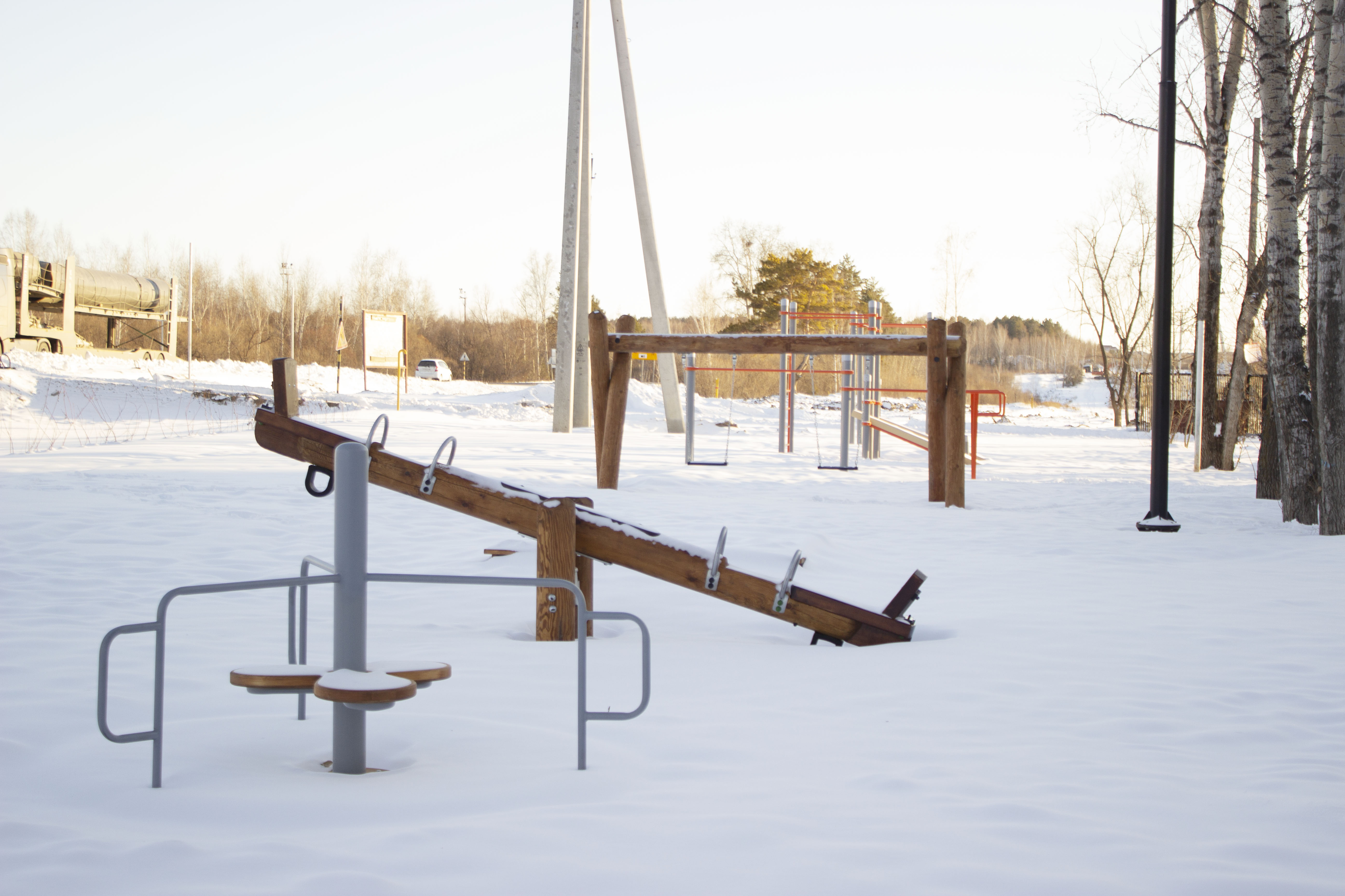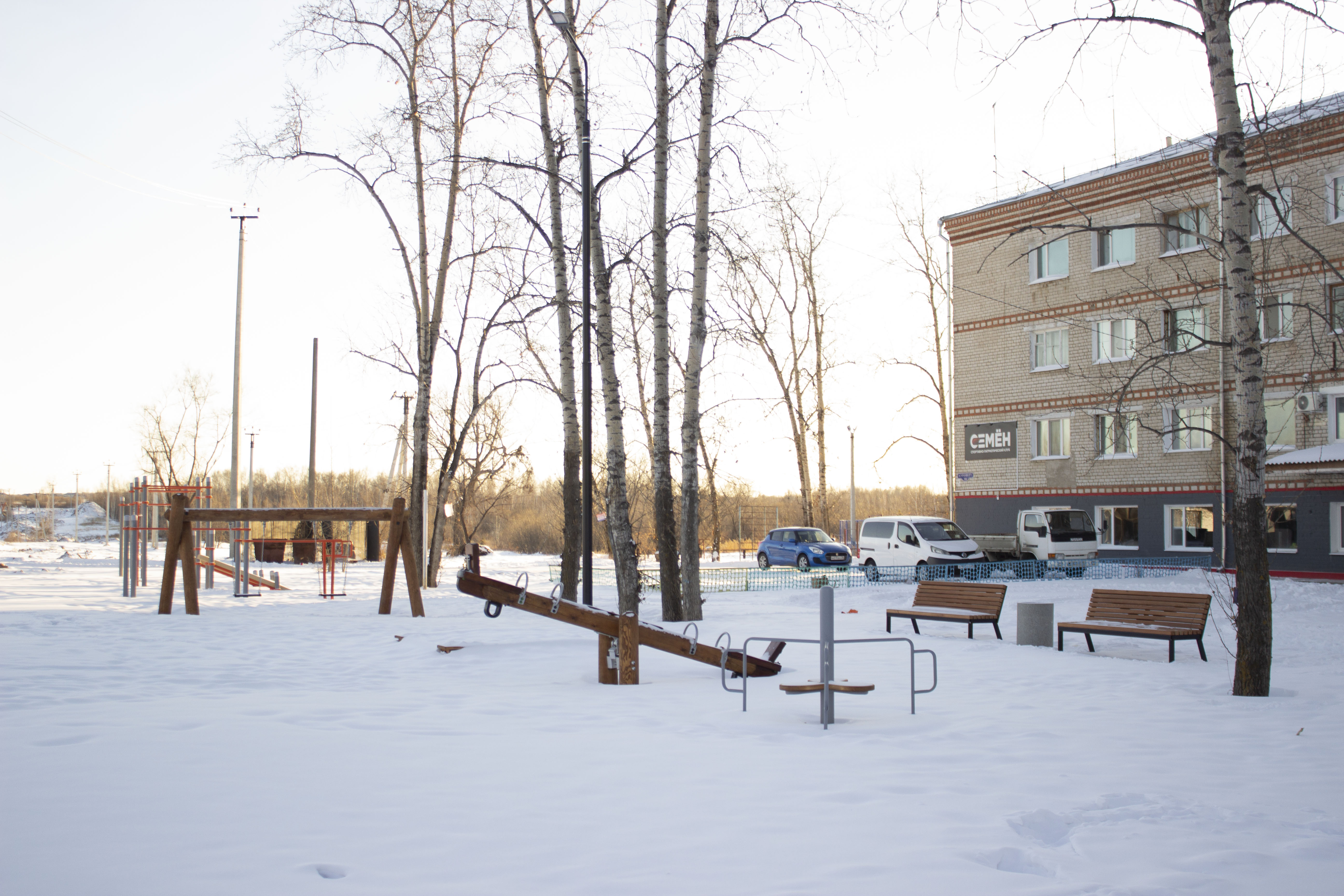 В качестве покрытия в спортивно-детском кластере использовали речной песок. Между зонами установили освещение.