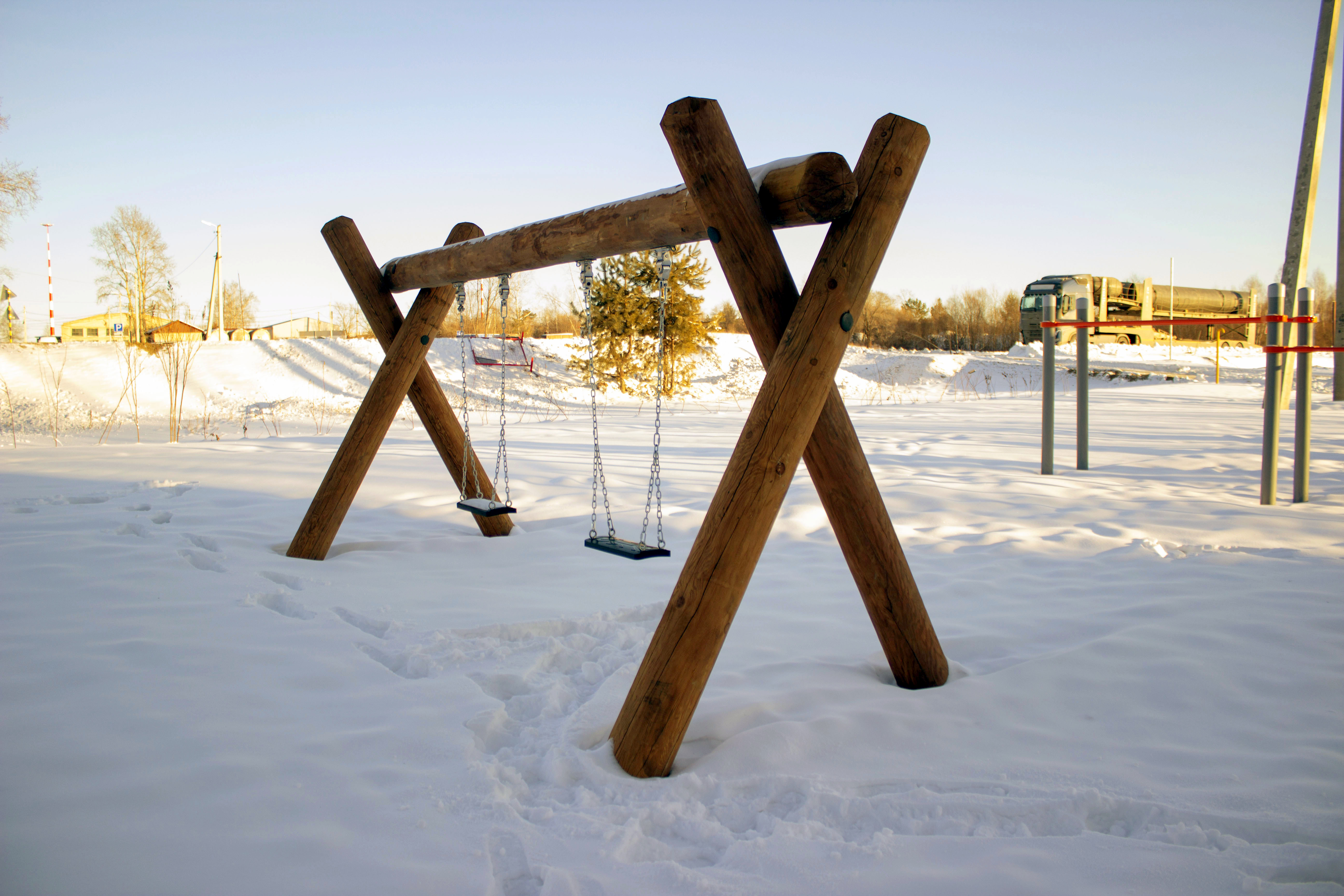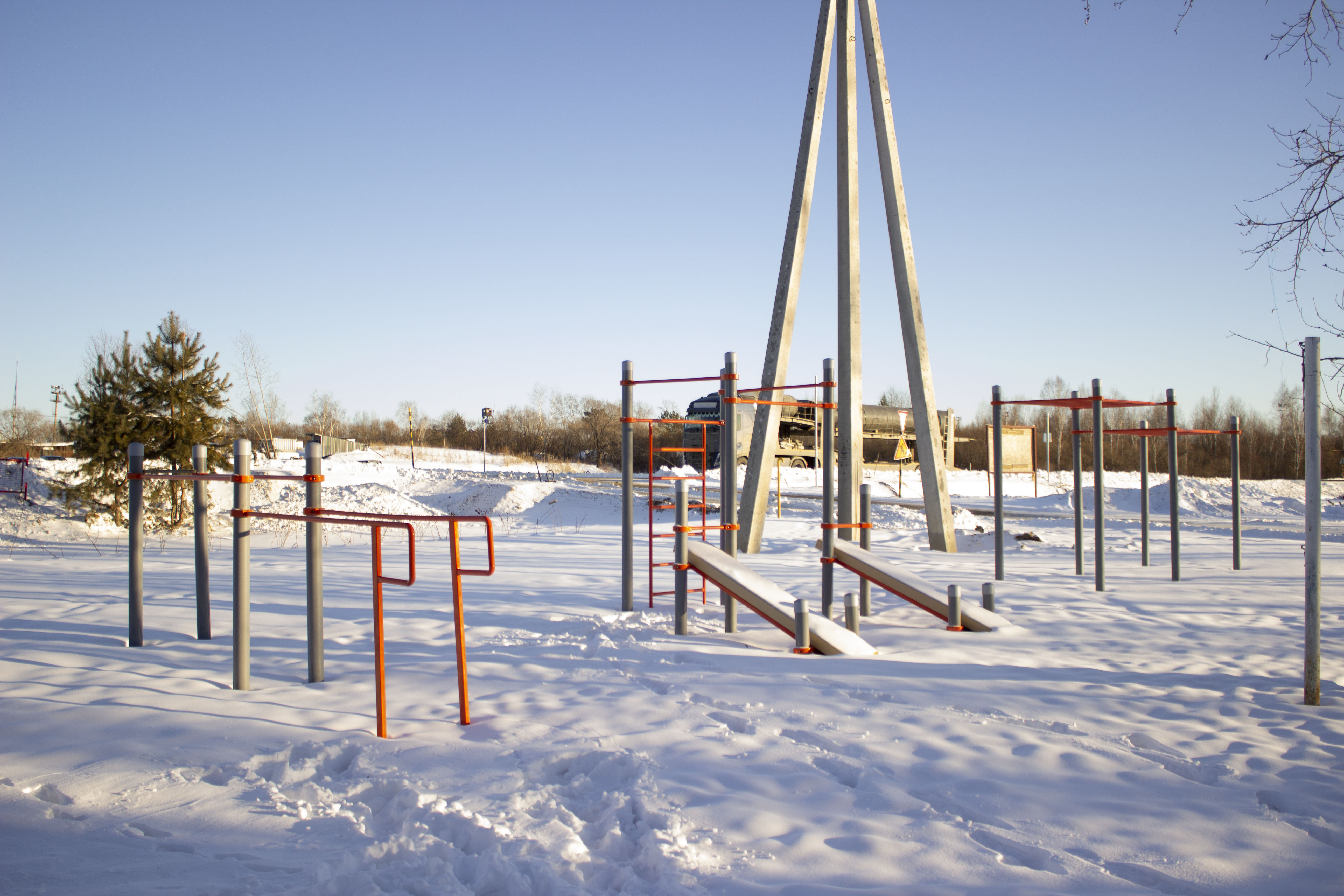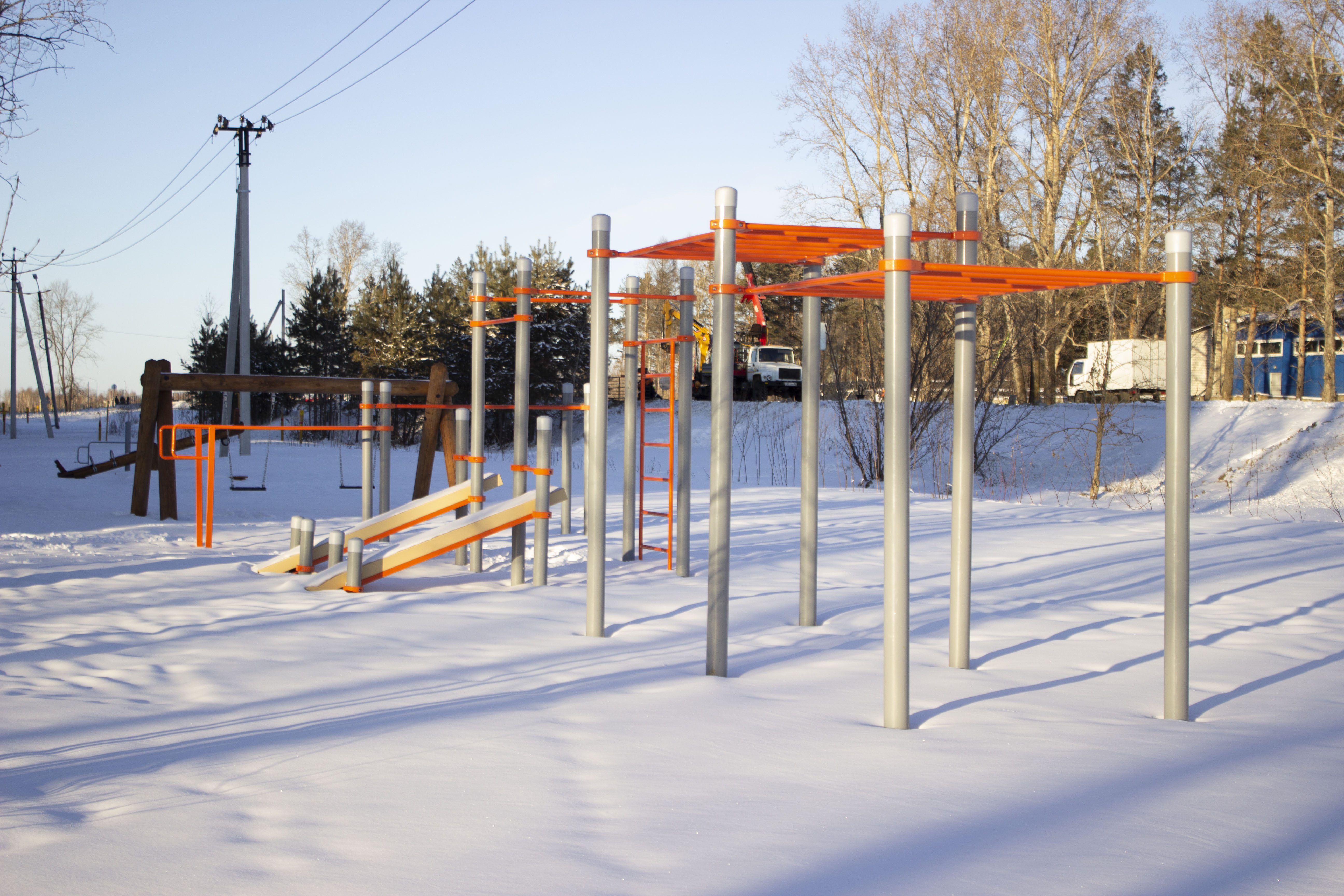 На территории сквера оборудовали детскую и спортивную зоны. Они находятся напротив дома № 10. Здесь жители поселка могут позаниматься на брусьях, рукоходе и воркаут-комплексе с наклонными скамьями и турниками.
